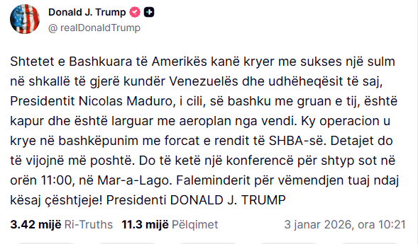 “Shtetet e Bashkuara të Amerikës kanë kryer me sukses një sulm në shkallë të gjerë kundër Venezuelës dhe udhëheqësit të saj, presidentit Nicolas Maduro, i cili, së bashku me bashkëshorten e tij, janë kapur dhe janë dërguar me avion jashtë vendit”, tha Trump.
