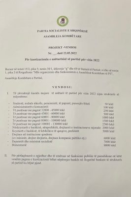 Ndërsa deputetët e ministrat socialistë do të japin nga 7 mijë lekë të reja. Të punësuarit anëtarë partie do të paguajnë nga 250 lekë deri në 2500 lekë.
