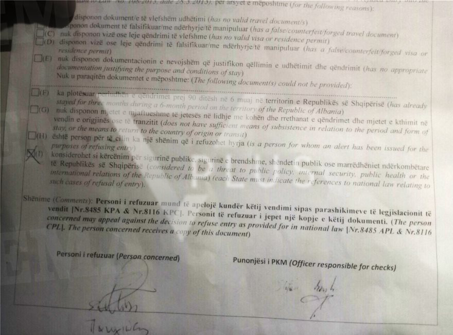 Dokumentimi i meposhtem tregon arsyetimin qe iu eshte paraqitur shtetasve qe nuk u lejuan te futen ne Shqiperi. Ata konsiderohen si kercenim per sigurine publike, sigurine e brendshme, shendetin publik ose marredheniet nderkombetare te Republikes se Shqiperise.