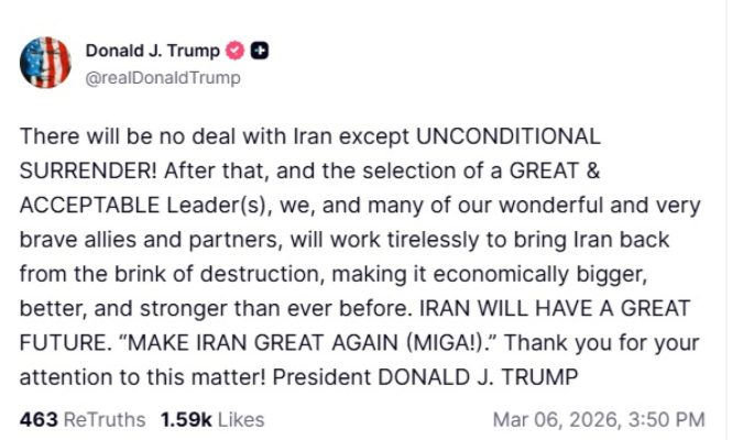Presidenti amerikan e bëri të qartë se e vetmja gjë që mund të pranojë është një “dorëzimi pa kushte” dhe më pas zgjedhja e udhëheqësit të ri të vendit pas vrasjes së Ali Khameneit.